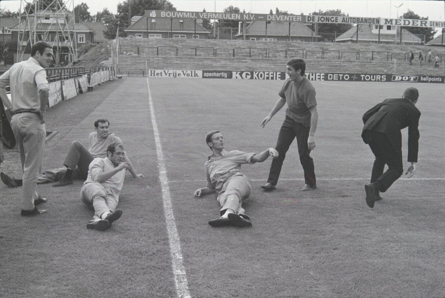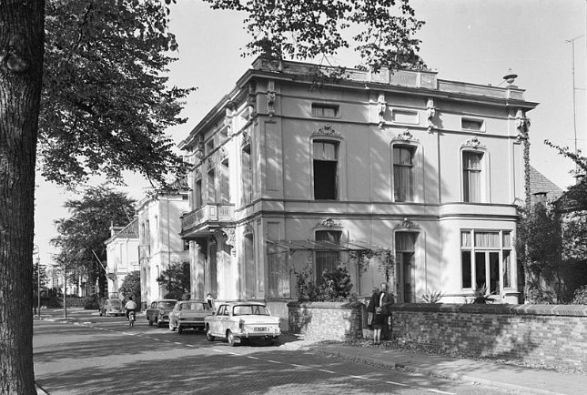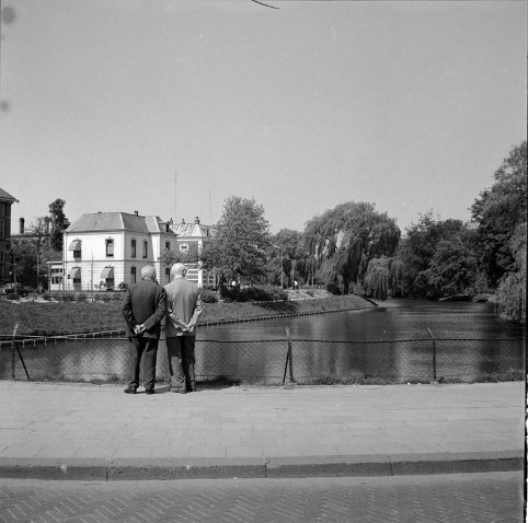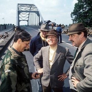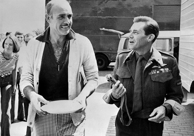 1976-08-01 16:55:45 US actors Sean Connery (L) and Dirk Bogarde are seen on the filming of "A Bridge Too Far" in August 1976 , in Deventer, Netherlands. AFP